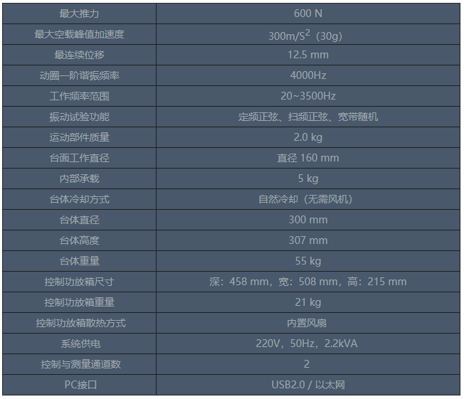 桌面上的振動臺。220V供電。自然冷卻(無需風機)。適合2kg以下試件。正弦、隨機振動。主要技術參數(shù)表